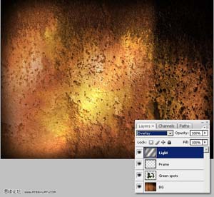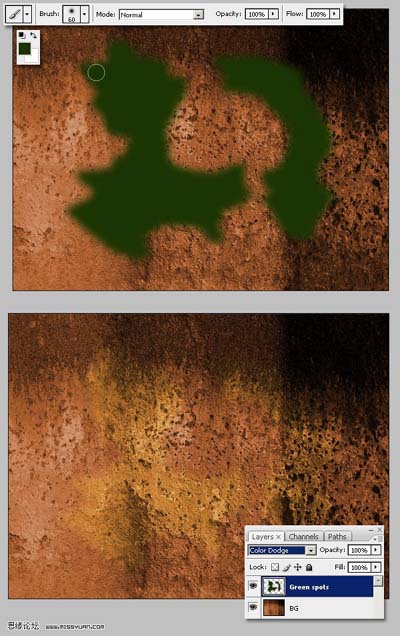 #p# 2、新建图层,green spot层,更改为【颜色减淡】模式,用柔角画笔 #1A3404 ,涂抹一些破旧的痕迹。