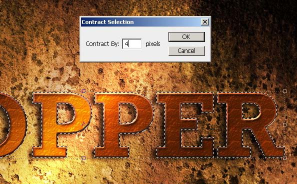 #p# 11、载入文字层选区,缩小选区4px