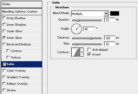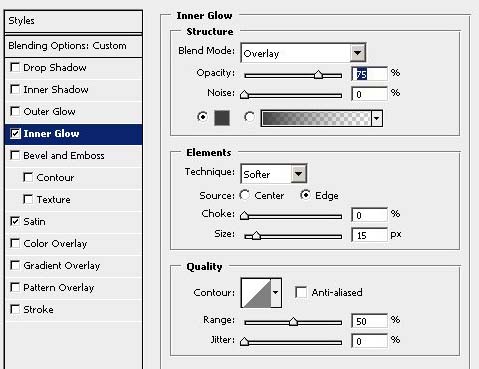 #p# 12、在文字层上新建图层(此时 Light层仍然置顶),命名为【内阴影】层,在选区内填充黑色,更改【填充】=0% , 设置图层样式 【内发光】 叠加模式 ,其他设置如图 ,【光泽】 正片叠底模式 ,其他设置如图。