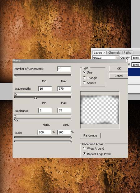 #p# 4、不要取消选区,反选,新建图层frame层填充选区范围黑色,取消选择,执行滤镜:滤镜-扭曲-波浪 。