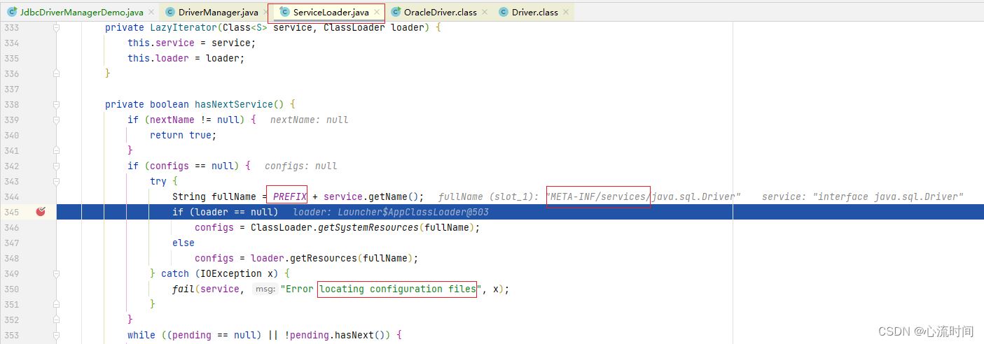 - 通过lookupIterator.hasNextService()方法读取固定目录META-INF/services/下面service全限定名文件,放在Enumeration对象configs中