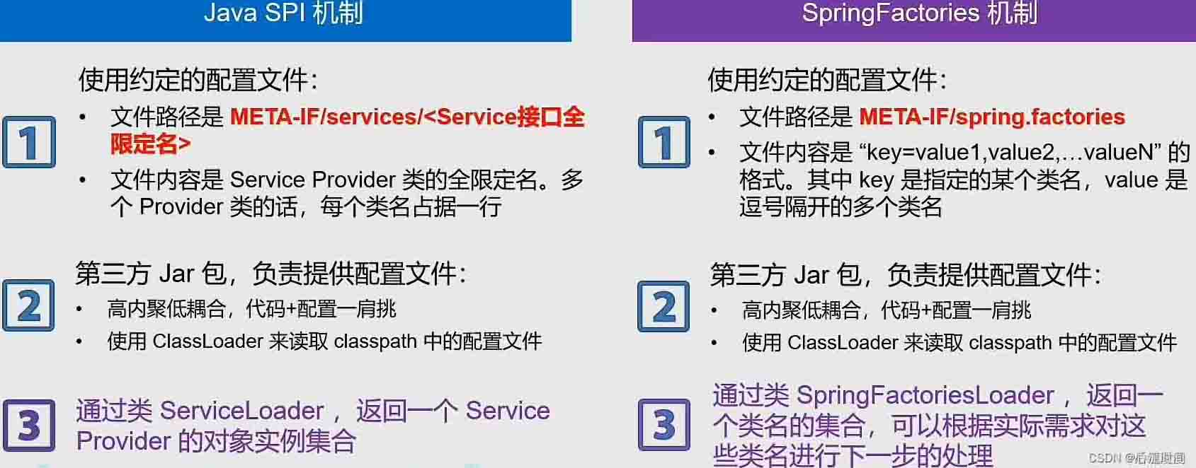 因此,虽然Spring Boot没有完全采用Java SPI的标准流程,但其自动装配过程中对第三方库和服务的发现和加载机制受到了SPI思想的启发,并在此基础上进行了扩展和创新。