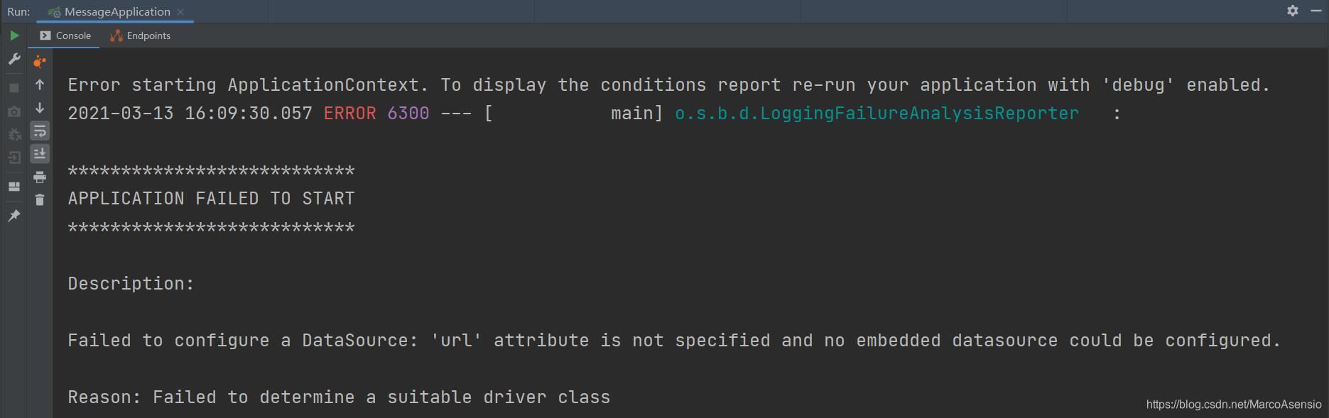 意思是 Spring Boot 项目启动失败,url 属性未指定,DataSource 创建失败。