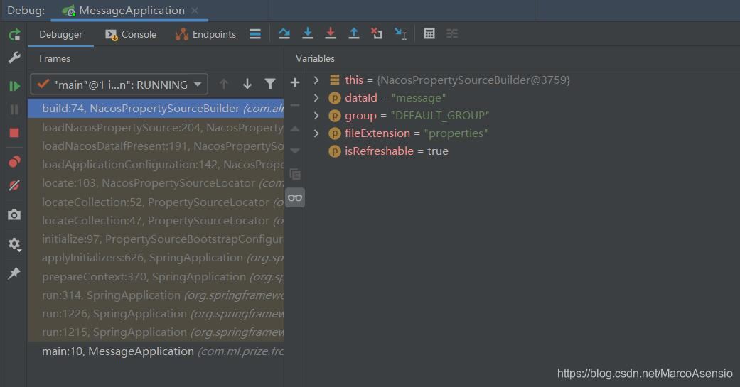 如果让我去设计一个注册中心的话,在程序启动的时候,我会首先解析出配置文件,找到注册中心的地址,恰恰 Nacos 也是这样做的。如果你有一定的源码阅读功底的话,你应该会很快的找到 Nacos 里面的 NacosPropertySourceBuilder 类,里面有个 build 方法。没错,这个类就是用来解析配置文件,构造 NacosPropertySource 对象的,我们在这个方法的第一行上打上断点,以 Debug 模式运行,发现这个断点一共运行了两次,两次的对象的值如下: