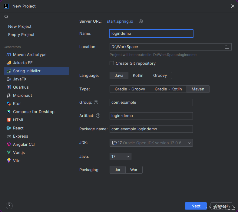 步骤 2:选择 “Spring Initializr”,填写项目信息