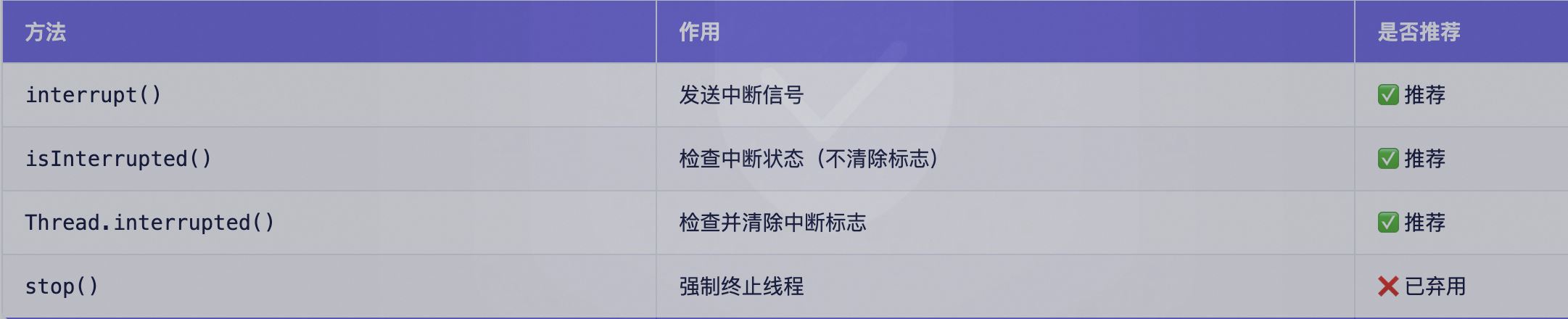 方法是 Java 早期提供的一种强制中止线程的方式,该方法会立即终止线程,而不执行清理工作(如释放资源、完成文件操作等),因此容易导致资源泄漏和线程安全问题,已被 Java 官方弃用。