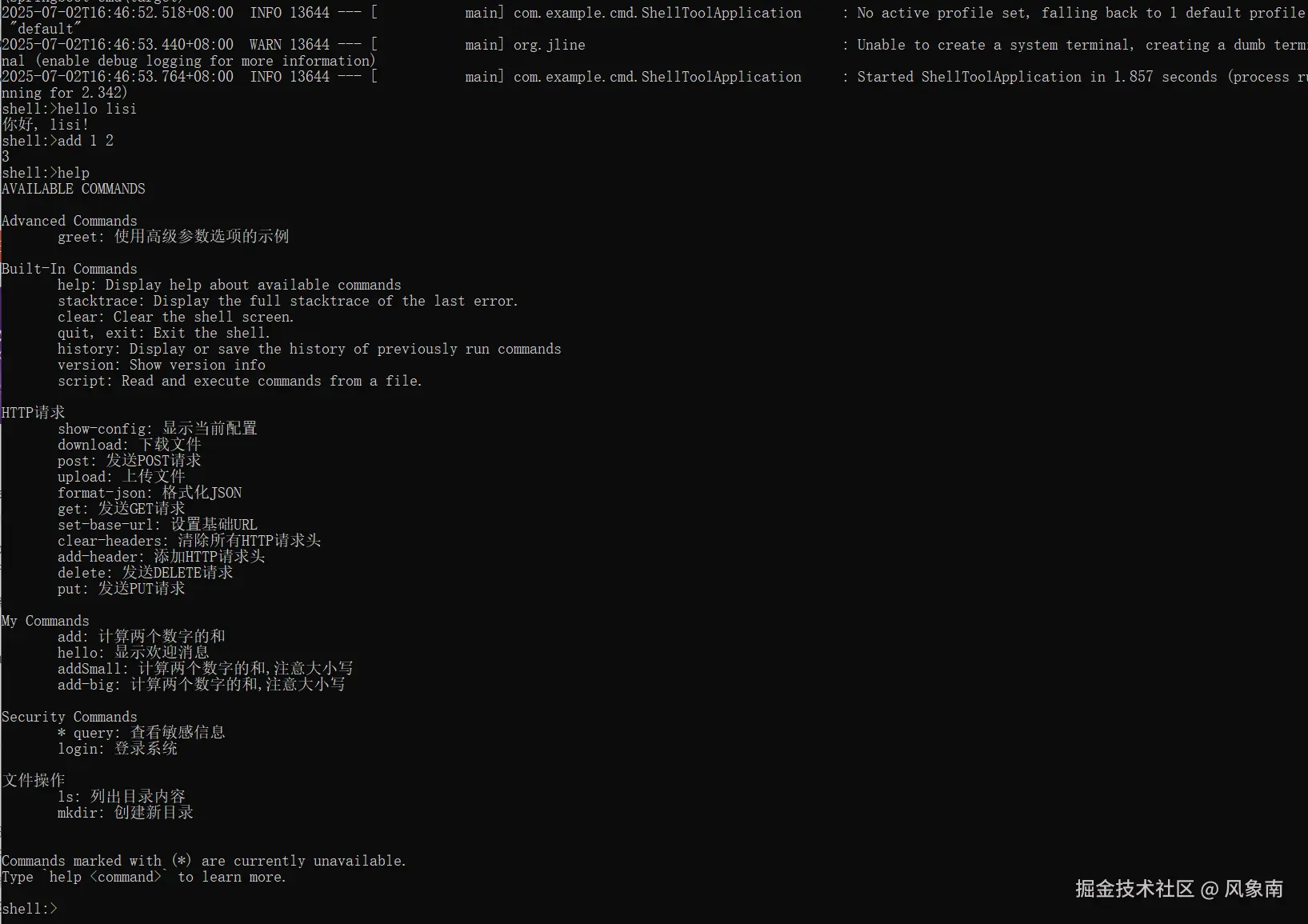 import org.springframework.shell.standard.ShellComponent; import org.springframework.shell.standard.ShellMethod; @ShellComponent public class MyCommands { @ShellMethod("显示欢迎消息") public String hello(String name) { return "你好, " + name + "!"; } @ShellMethod("计算两个数字的和") public int add(int a, int b) { return a + b; } // 注意: 如果方法名为驼峰式命名,则shell使用时需要使用-分隔符,如addBig -> add-big @ShellMethod(value = "计算两个数字的和,注意大小写") public int addBig(int a, int b) { return a + b; } // 关于驼峰命名也可以使用key属性进行指定,则shell使用时仍然是驼峰式命名,如addSmall -> addSmall @ShellMethod(value = "计算两个数字的和,注意大小写",key = {"addSmall"}) public int addSmall(int a, int b) { return a + b; } }