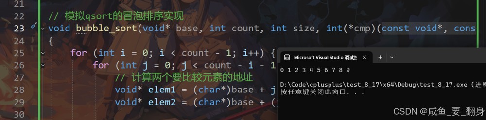 这段代码实现了一个通用的冒泡排序函数,模仿了C标准库中的qsort