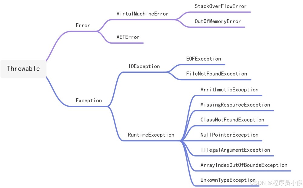 错误:Error类以及他的子类的实例,代表了JVM本身的错误。错误不能被程序员通过代码处理,Error很少出现。因此,程序员应该关注Exception为父类的分支下的各种异常类。