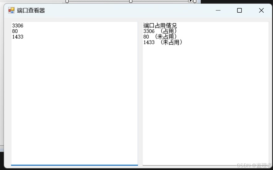 private void timer1_Tick(object sender, EventArgs e) { string[] strings = textBox1.Text.Split(new[] { "\r\n" }, StringSplitOptions.None); string info = "端口占用情况\r\n"; foreach (var a in strings) { if (int.TryParse(a, out int port)) { if (IsPortInUse(port)) { info += $"{a} (占用)\r\n"; } else { info += $"{a} (未占用)\r\n"; } } } textBox2.Text = info; } // 检查端口是否被占用 public bool IsPortInUse(int port) { // 初始化一个布尔变量,默认端口未被占用 bool inUse = false; // 获取本地机器的网络属性信息 IPGlobalProperties ipProperties = IPGlobalProperties.GetIPGlobalProperties(); // 获取当前正在监听的TCP端点集合 IPEndPoint[] endPoints = ipProperties.GetActiveTcpListeners(); // 遍历所有活动的TCP端点 foreach (IPEndPoint endPoint in endPoints) { // 如果端点的端口号与传入的端口号相同,则表示端口被占用 if (endPoint.Port == port) { // 设置inUse为true,表示端口被占用 inUse = true; // 退出循环,因为已经找到了被占用的端口 break; } } // 返回端口是否被占用的结果 return inUse; }