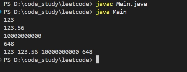 public static void main(String[] args) { Scanner sc = new Scanner(System.in); //用于从控制台读入数据 //获取int类型数据 Integer a = sc.nextInt(); //获取Double类型数据 Double d = sc.nextDouble(); //获取long类型数据 long l = sc.nextLong(); //获取short类型数据 short b = sc.nextShort(); System.out.print(a + " " + d + " " + l + " " + b + " "); }
