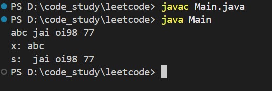 public static void main(String[] args) { Scanner sc = new Scanner(System.in); //用于从控制台读入数据 String x = sc.next(); String s = sc.nextLine(); System.out.println("x: " + x); System.out.println("s: " + s); }