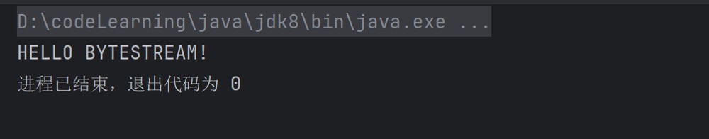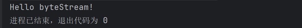 import java.io.*; public class Main { public static void main(String[] args) { // 写入文件 try { BufferedOutputStream bufferedOutputStream =new BufferedOutputStream(new FileOutputStream("file.txt")); String data="Hello byteStream!"; bufferedOutputStream.write(data.getBytes()); bufferedOutputStream.close(); } catch (IOException e) { throw new RuntimeException(e); } try { BufferedInputStream bufferedInputStream =new BufferedInputStream(new FileInputStream("file.txt")); int c; while((c=bufferedInputStream.read())!=-1){ System.out.print((char)c); } } catch (IOException e) { throw new RuntimeException(e); } } }