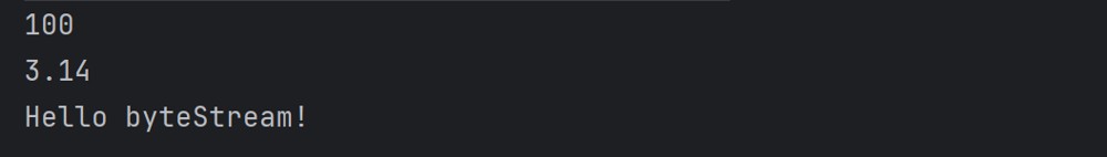 import java.io.*; public class Main { public static void main(String[] args) { // 写入文件 try { DataOutputStream bufferedOutputStream =new DataOutputStream(new FileOutputStream("file.bat")); bufferedOutputStream.writeInt(100); // 写入整数 bufferedOutputStream.writeDouble(3.14); // 写入双精度浮点数 bufferedOutputStream.writeUTF("Hello byteStream!"); bufferedOutputStream.close(); } catch (IOException e) { throw new RuntimeException(e); } try { DataInputStream bufferedInputStream =new DataInputStream(new FileInputStream("file.bat")); System.out.println(bufferedInputStream.readInt()); System.out.println(bufferedInputStream.readDouble()); System.out.println(bufferedInputStream.readUTF()); } catch (IOException e) { throw new RuntimeException(e); } } }