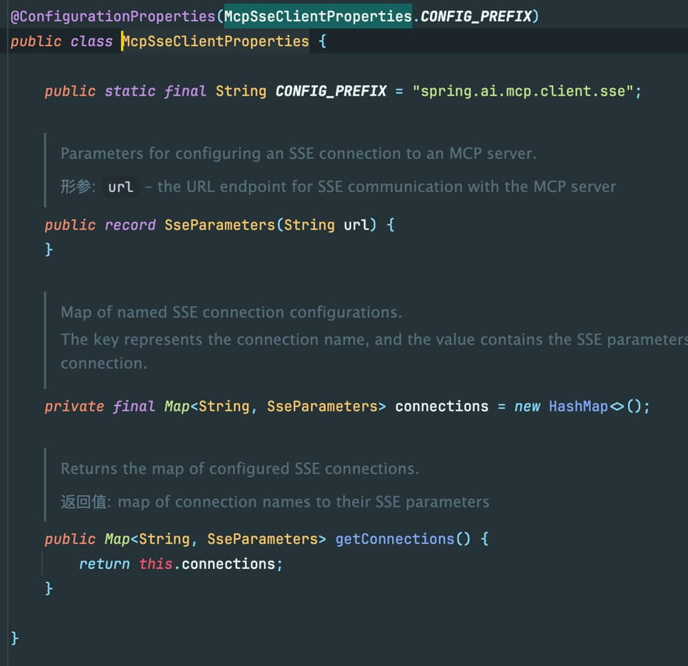 按照server端的经验,编写自定义config,此处需要注意,因为yaml里并不存在sseEndpoint这个key,我们需要先自定义一个SseClientProperties,替换源码里的McpSseClientProperties