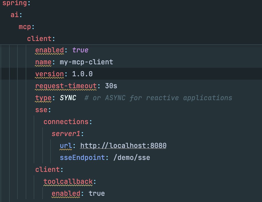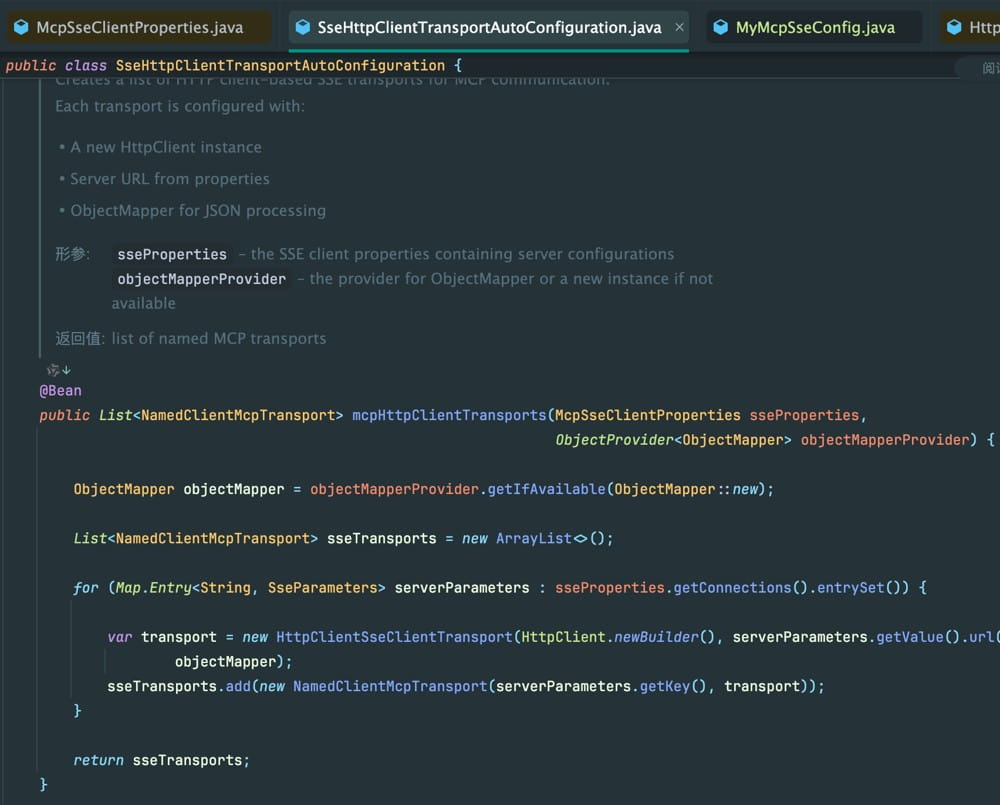 @Configuration public class MyMcpSseConfig { private final SseClientProperties sseClientProperties; public MyMcpSseConfig(SseClientProperties sseClientProperties) { this.sseClientProperties = sseClientProperties; } @Bean // @Primary public List<NamedClientMcpTransport> mcpHttpClientTransports(SseClientProperties sseProperties, ObjectProvider<ObjectMapper> objectMapperProvider) { ObjectMapper objectMapper = objectMapperProvider.getIfAvailable(ObjectMapper::new); List<NamedClientMcpTransport> sseTransports = new ArrayList<>(); for (Map.Entry<String, SseClientProperties.Connection> serverParameters : sseProperties.getConnections().entrySet()) { String url = serverParameters.getValue().getUrl(); String sseEndpoint = serverParameters.getValue().getSseEndpoint(); var transport = new HttpClientSseClientTransport(HttpClient.newBuilder(), url, sseEndpoint, objectMapper); sseTransports.add(new NamedClientMcpTransport(serverParameters.getKey(), transport)); } return sseTransports; } }