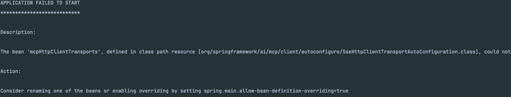 询问模型后,发现是因为Spring Boot 中,同名的 Bean 不能重复注册, mcpHttpClientTransports 这个 Bean,在两个地方都被定义了: 1个在官方自动配置 SseHttpClientTransportAutoConfiguration, 1个在自己的配置类 MyMcpSseConfig
