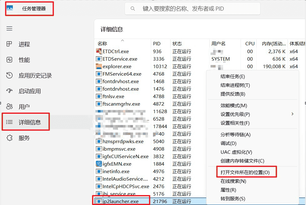 打开任务管理器(Ctrl+Shift+Esc),点击详细信息,找到jp2launcher.exe,并右键点击打开文件所在的位置;