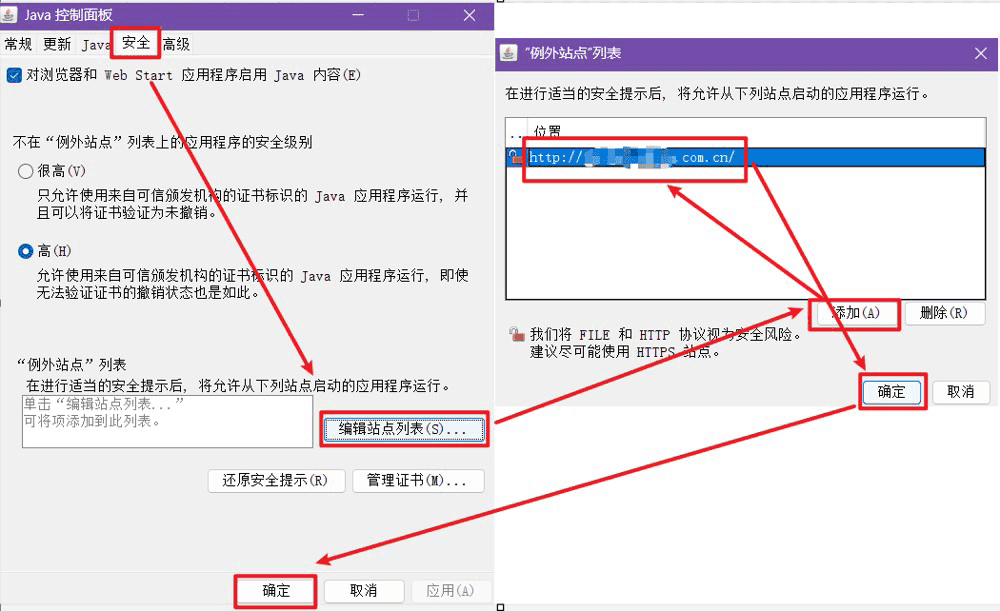 点击安全,点击编辑站点列表,点击添加,将需要允许的网站添加进去,然后一路点击确定即可(这个比较适用于系统安装了多个jre程序的情况,如果系统只安装了一个jre,则在右下角直接搜索Java配置,按照下述图片配置即可);