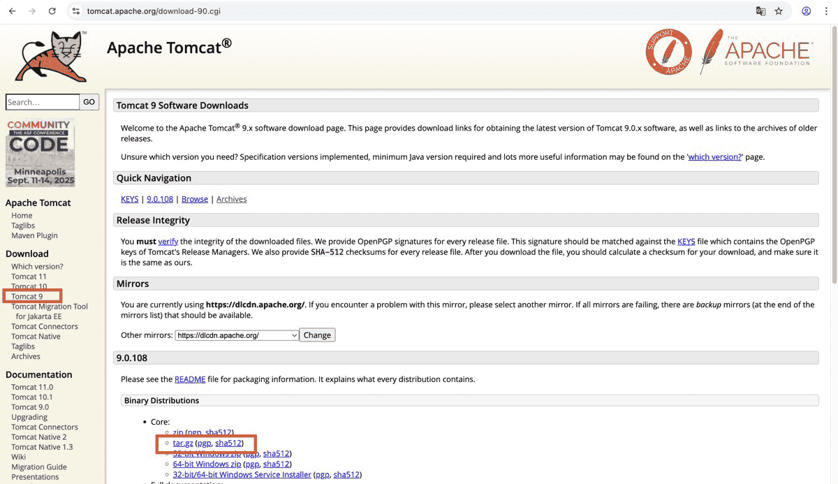 这里我们下载tomcat9,因为是mac环境,所以选择tar.gz