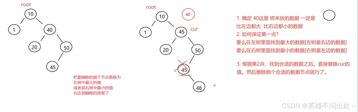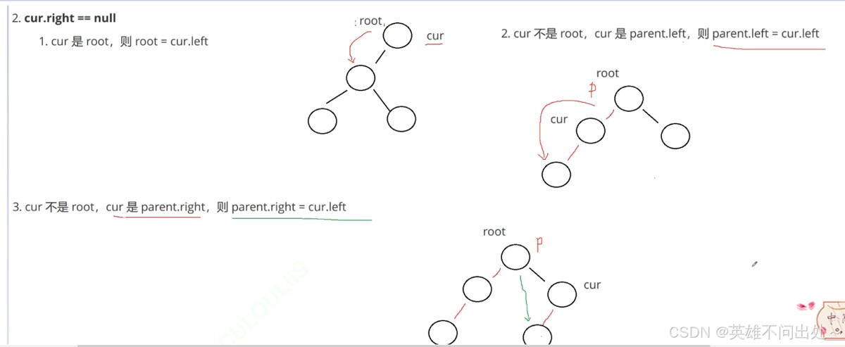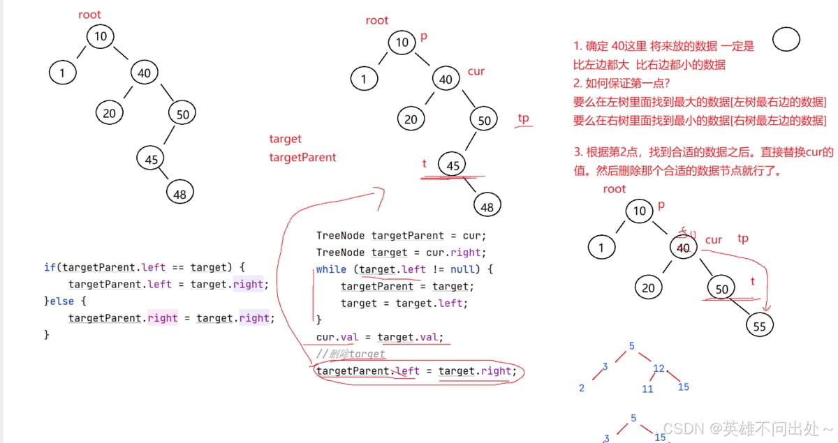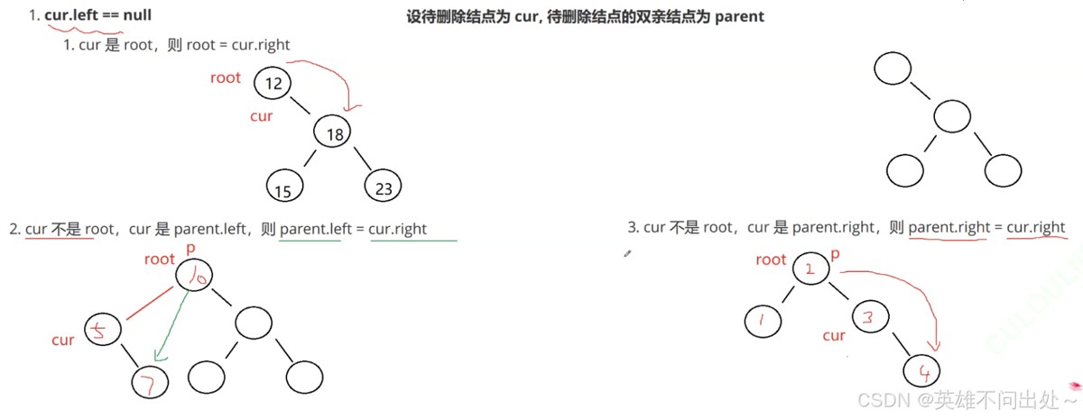 // 删除 private void removeNode(TreeNode cur, TreeNode parent) { if(cur.left == null){ // 要删除的是根节点 if(cur == root){ root = cur.right; }else if(cur == parent.left){ parent.left = cur.right; }else{ parent.right = cur.right; } }else if(cur.right == null){ if(cur == root){ root = cur.left; }else if(cur == parent.left){ parent.left = cur.left; }else{ parent.right = cur.left; } }else{ // cur.left != null && cur.right != null TreeNode parentTarget = cur; TreeNode target = cur.right; // 在右树中找最小值 while(target.left != null){ parentTarget = target; target = target.left; } // 直到找到右树中的最左边的树 cur.val = target.val; // 删除target if(parentTarget.left == target) { parentTarget.left = target.right; }else{ // parentTarget.right == target parentTarget.right = target.right; } } }
