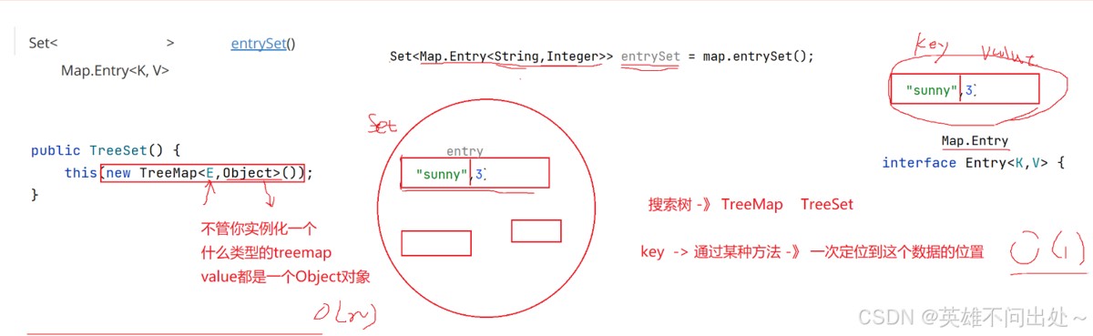 public static void main(String[] args) { Map<String,Integer> map = new TreeMap<>();// 底层是红黑树,查找的时间复杂度O(N*logN) // 插入元素 map.put("push",3);// push出现了3次 // 获取元素,给定一个key值可以获取它的value值 Integer val = map.get("push"); Integer val1 = map.get("aaa");// null // 获取val值,如果没有这个值,返回一个默认值 Integer val2 = map.getOrDefault("bbb",99999); System.out.println(val); // 删除key值 // map.remove("push"); // 把所有的key放入一个集合中 Set<String> set = map.keySet(); System.out.println(set); // 获取values中的所有值 ArrayList<Integer> value = new ArrayList(map.values()); System.out.println(value); // 把Map.Entry<String,Integer>当做Set中的一个节点 // map.entrySet()用于获取这种节点 Set<Map.Entry<String,Integer>> entrySet = map.entrySet(); for(Map.Entry<String,Integer> entry : entrySet){ System.out.println("key: " + entry.getKey() + " value: " + entry.getValue()); } // boolean map.containsKey("push"); 判断是否含有key // boolean map.containsValue(3); 判断是否含有value Map<String,Integer> map1 = new HashMap<>();// 底层是哈希表,查找的时间复杂度O(1) // 哈希表 = 数组 + 链表 + 红黑树 }