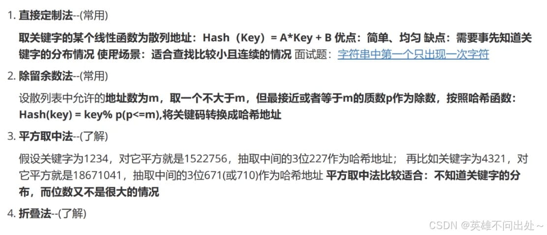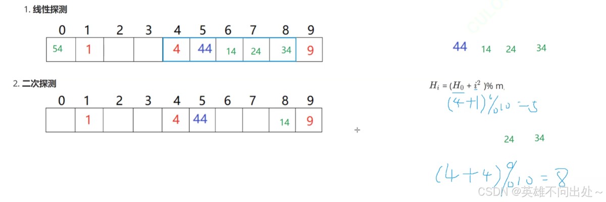 - 二次探测:为了解决线性探测的缺点,通过公式进行处理,H0是当前冲突的位置,i是出现冲突的次数,m是哈希表的大小,Hi表示冲突后,下一次要放的位置