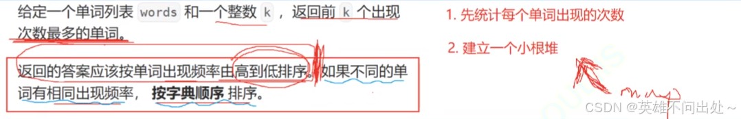 class Solution { public List<String> topKFrequent(String[] words, int k) { // 1. 统计单词出现的次数 Map<String,Integer> map = new HashMap<>(); for(String s : words){ if(!map.containsKey(s)){ map.put(s,1); }else{ int val = map.get(s); map.put(s,val+1); } } // 2. 把单词和出现的次数当做一个整体放入小根堆中 PriorityQueue<Map.Entry<String,Integer>> minHeap = new PriorityQueue<>( new Comparator<Map.Entry<String,Integer>>(){ public int compare(Map.Entry<String,Integer> o1,Map.Entry<String,Integer> o2){ // 放元素的时候,如果频率相同,我们转变为大根堆 -> 按照单词的字典序进行排序 if(o1.getValue().compareTo(o2.getValue()) == 0){ return o2.getKey().compareTo(o1.getKey()); } return o1.getValue().compareTo(o2.getValue()); } }); for(Map.Entry<String,Integer> entry : map.entrySet()){ if(minHeap.size() < k){ // 没有放满小根堆 minHeap.add(entry); }else{ // 放满了和堆顶元素比较大小 // 如果比堆顶元素还大,就入堆 int v = minHeap.peek().getValue(); if(v < entry.getValue()){ minHeap.poll(); minHeap.offer(entry); }else{ // 出现频率相同,比较字典序大小 if(v == entry.getValue()){ if(minHeap.peek().getKey().compareTo(entry.getKey()) > 0){ minHeap.poll(); minHeap.offer(entry); } } } } } // 2 3 4 -> 4 3 2 List<String> arr = new ArrayList<>(); for(int i = 0;i < k;i++){ Map.Entry<String,Integer> top = minHeap.poll(); arr.add(top.getKey()); } // 逆置 Collections.reverse(arr); return arr; } }