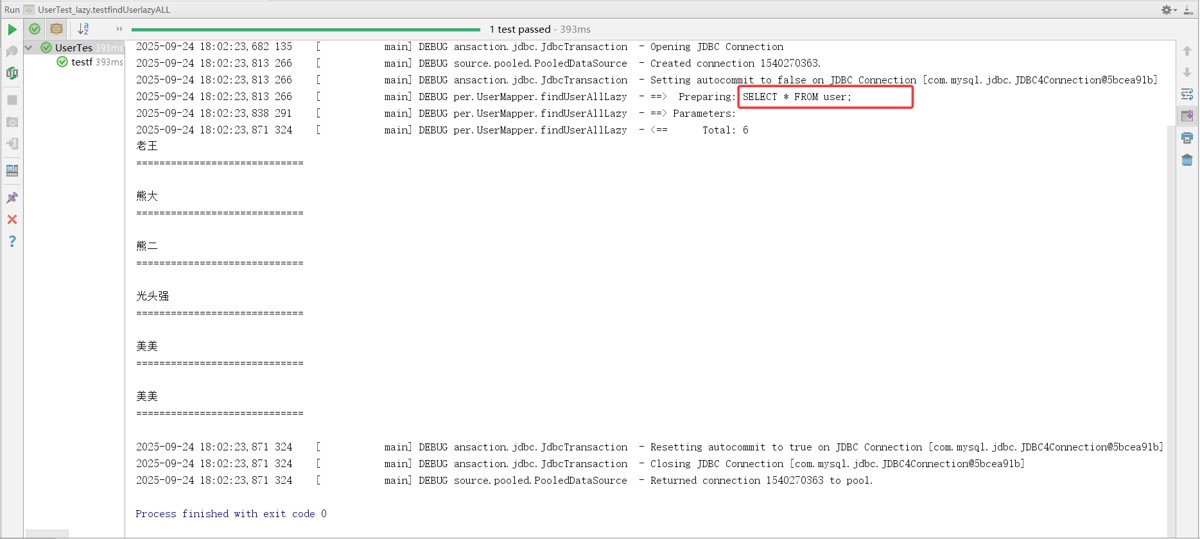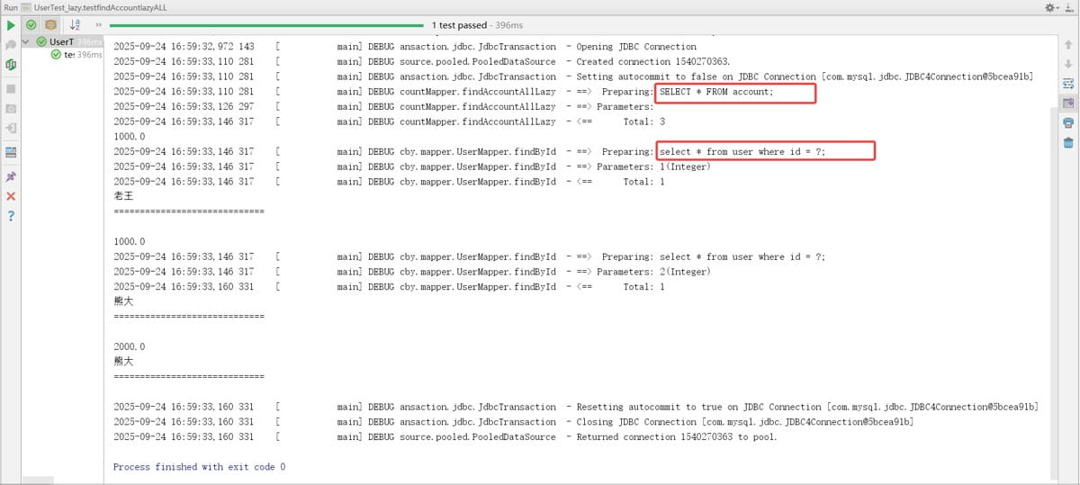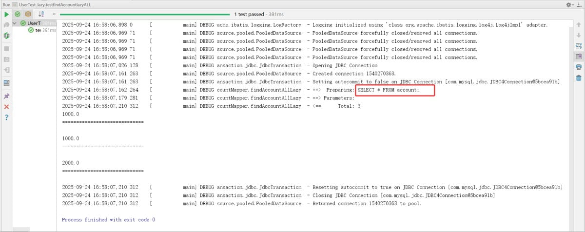 运行 testfindAccountlazyALL() 方法,延迟加载,先查询账户信息,当需要用户信息时再单独查询,减少不必要的数据库交互