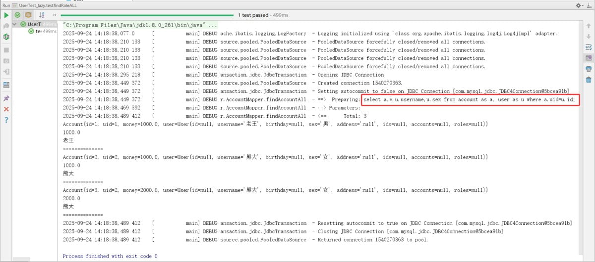 运行 testfindRoleALL() 方法,立即加载,通过内连接一次性查询账户和关联的用户信息