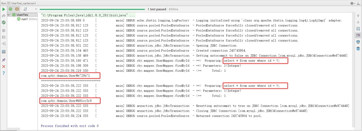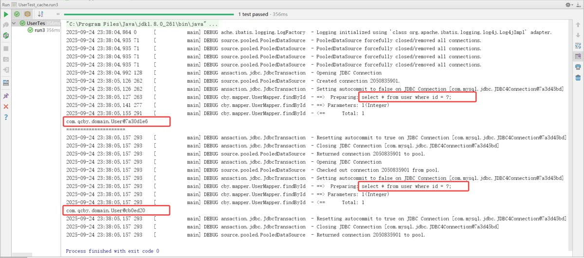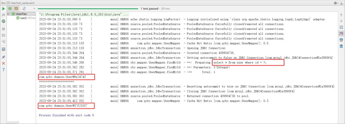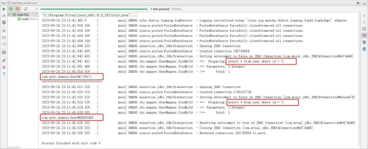 两次查询分别在两个独立的SqlSession实例中执行,而 MyBatis 的一级缓存作用域严格限定于单个SqlSession,这两个会话各自维护一个独立且初始为空的缓存。因此,第一次查询命中第一个SqlSession的空缓存,触发数据库访问并生成一条 SQL 日志,结果存入该会话的缓存;第二次查询同样命中第二个SqlSession的空缓存,再次触发数据库访问并生成第二条 SQL 日志,结果存入第二个会话的缓存。由于两次查询返回的是两个不同的User对象实例,因此它们的哈希码标识不同。这一现象清晰地证明了一级缓存的会话隔离性,即缓存数据无法在不同SqlSession之间共享。