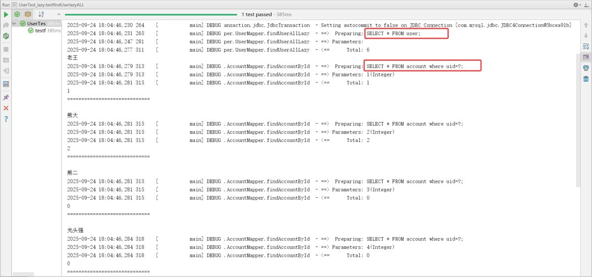 输出 user.getAccounts().size() 时,第一步固定执行查询所有用户信息 SELECT * FROM user;,访问到User对象的accounts属性触发延迟加载,第二步执行子查询语句 SELECT * FROM account where uid = ?; ,其中?会被替换为传入的column="id"的具体用户的id值