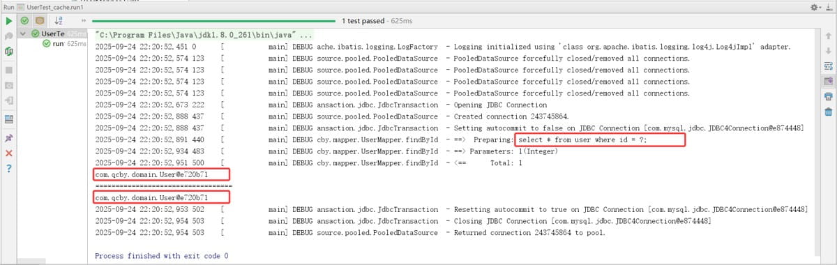 尽管进行了两次查询,但日志中仅出现了一条 SQL 语句的执行记录,且两次查询输出的User对象引用地址完全相同,这说明第二次查询并未重新执行 SQL 去数据库获取数据,而是直接复用了第一次查询后缓存到内存中的User对象,符合一级缓存缓存主线程同一会话中相同查询条件的结果的特性。