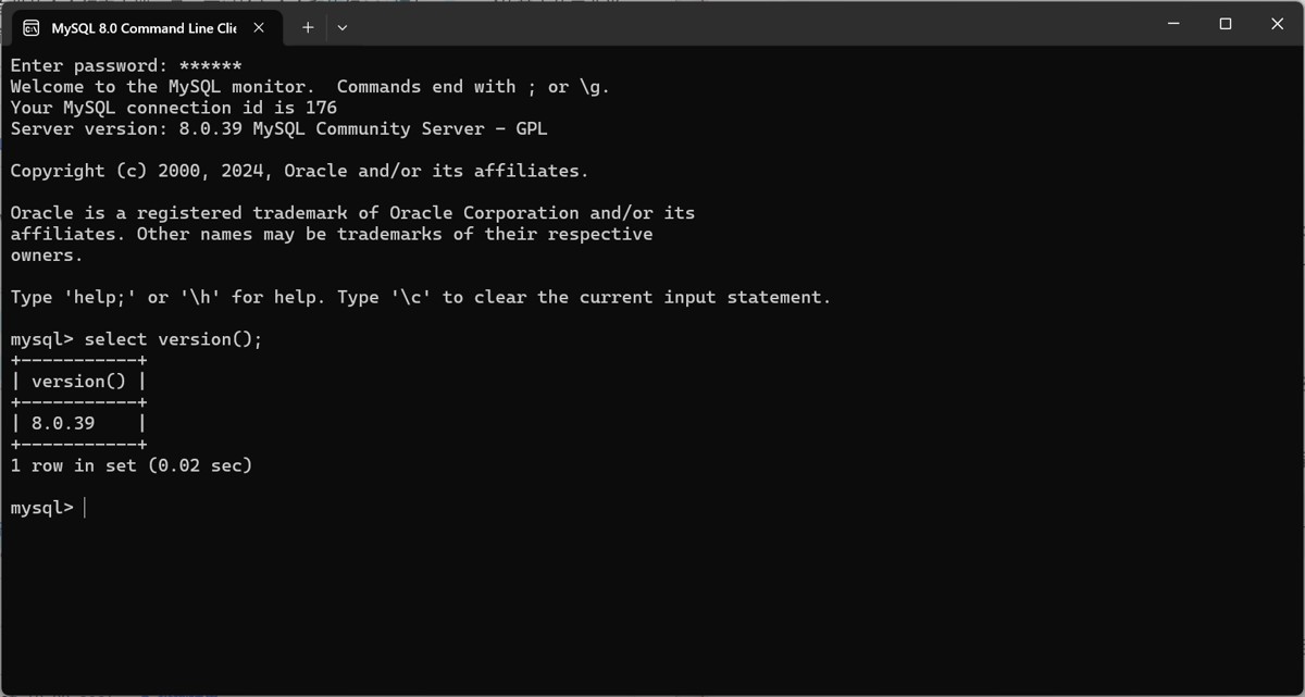我们输入安装时就设置的密码,连接成功了,我们使用select version( )的SQL语句查看了当前MySQL的版本