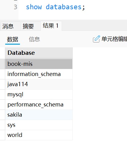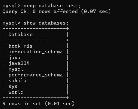 我们删除test数据库,可以观察到删除后test数据库不存在了