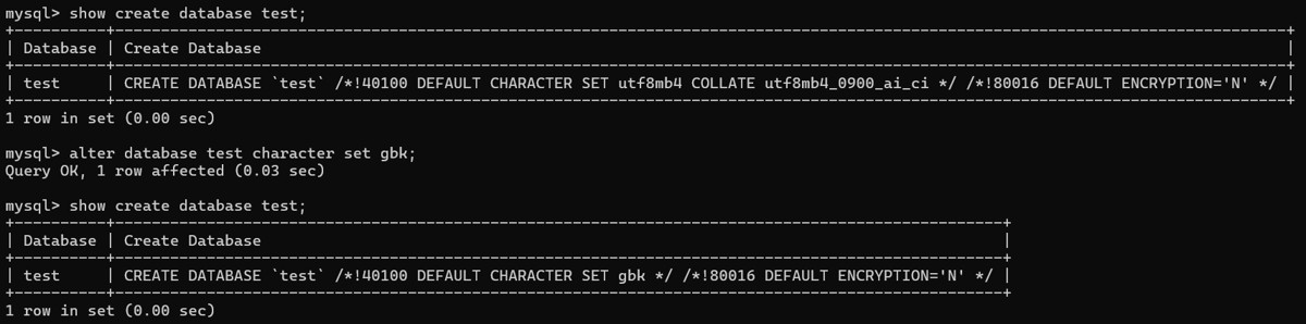 可以观察到修改之前默认字符集为utf8mb4,修改后则为gbk