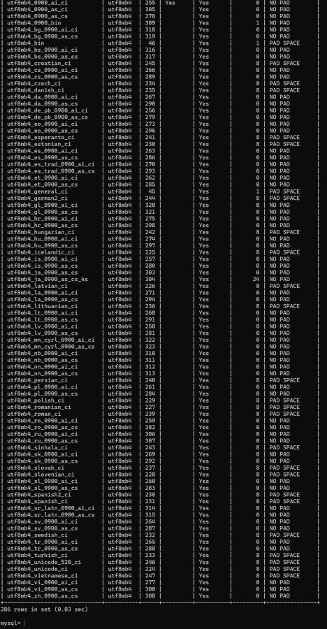 这里我们只显示部分排序排序规则,MySQL8.0默认的排序规则是 utf8mb4_0900_ai_ci,MySQL5.7默认排序规则是utf8mb4_general_ci