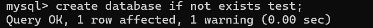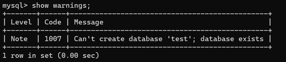 我们加上 if not exists,观察发现数据库里面已经存在test,所以没有创建,出现了一个警告
