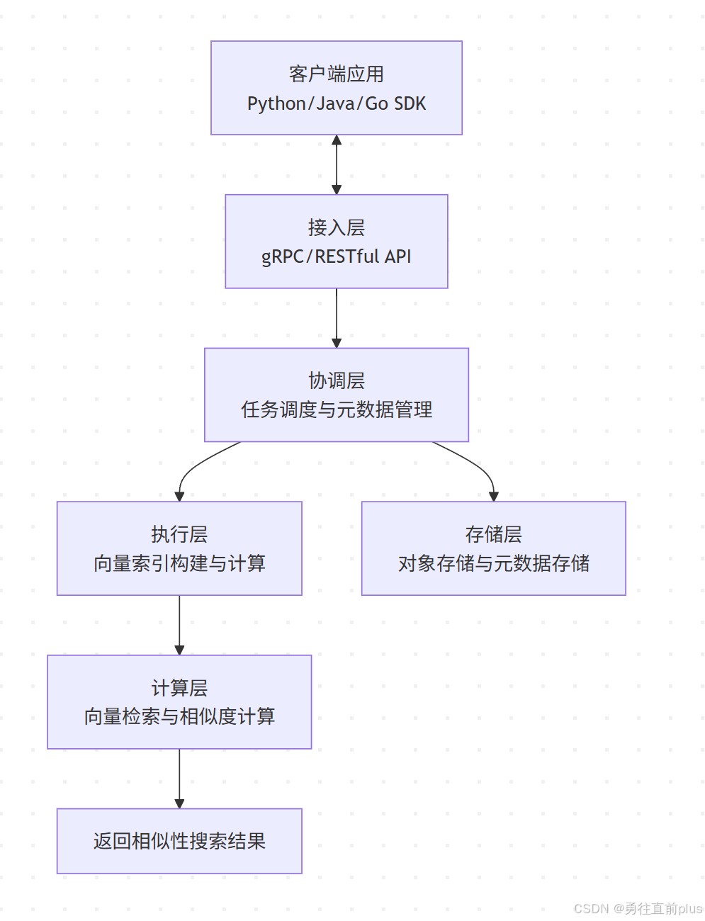 上面这个图是Milvus的核心系统架构图,和mysql、pg等数据库的系统架构很像,其核心工作流程可以概括为以下几个步骤: