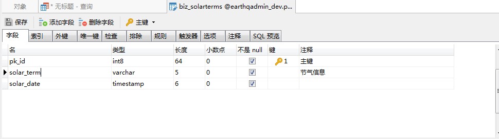 /*==============================================================*/ /* Table: biz_solarterms */ /*==============================================================*/ create table biz_solarterms ( pk_id INT8 not null, solar_term VARCHAR(5) not null, solar_date TIMESTAMP not null, constraint PK_BIZ_SOLARTERMS primary key (pk_id) ); comment on table biz_solarterms is '节气时间信息表,用于存储节气及其对应的日期'; comment on column biz_solarterms.pk_id is '主键'; comment on column biz_solarterms.solar_term is '节气信息'; comment on column biz_solarterms.solar_date is '节气日期';