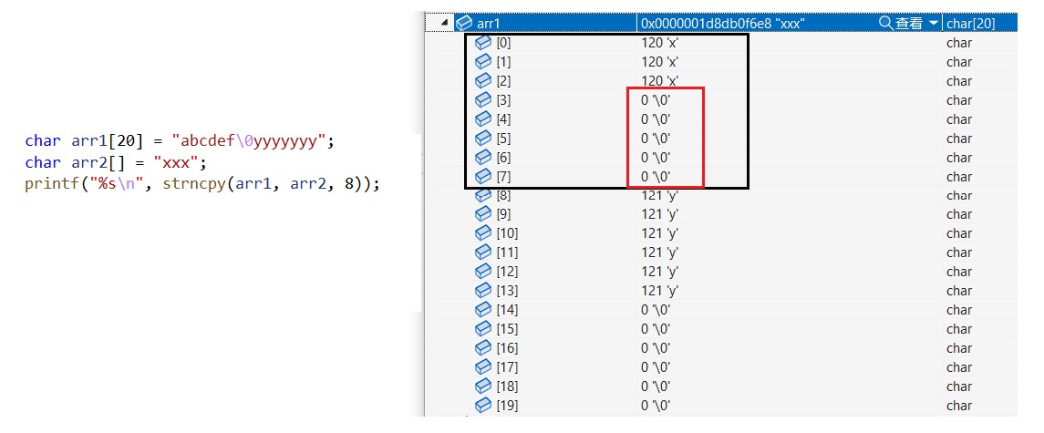 1.6.2 当源字符串长度小于n时,将不在追加,后面直接加一个'\0'。
