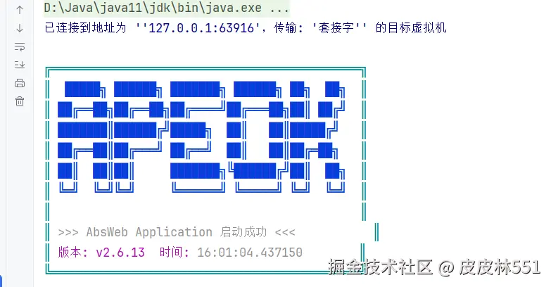 =========================================== == AbsWeb 启动成功! 🚀 == == 端口:${server.port} == == 环境:${spring.profiles.active} == == 时间:${date} == ===========================================
