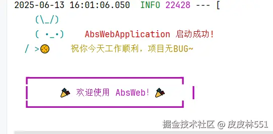 ${AnsiColor.BRIGHT_CYAN} =========================================== == AbsWeb 启动成功! 🚀 == == 端口:${server.port} == == 环境:${spring.profiles.active} == == 时间:${date} == =========================================== ${AnsiColor.DEFAULT}