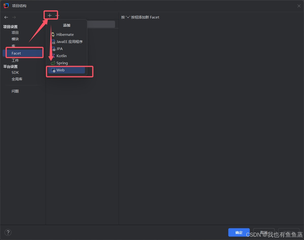 第四步:在弹出来的页面中选择Facet,点击+号,选择Web,点击确定