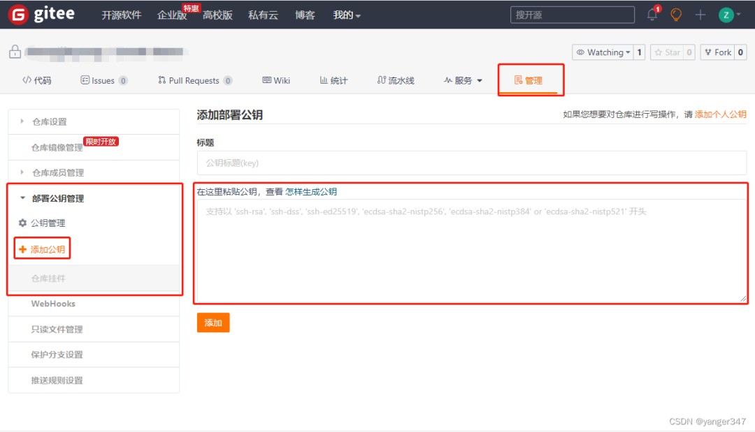 通过仓库主页 「管理」->「部署公钥管理」->「添加部署公钥」 ,添加生成的 public key