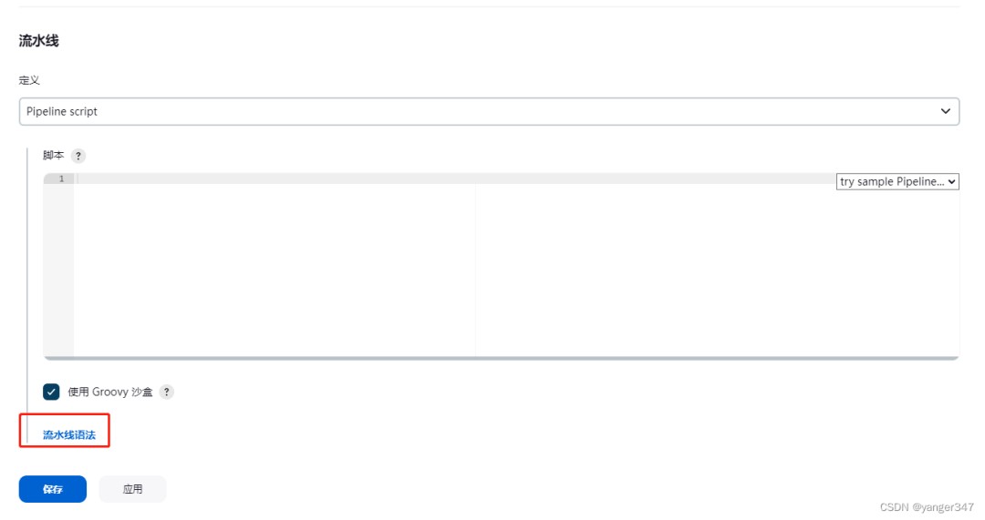 拉到最下面的流水线,写pipeline脚本,如果不知道怎么写,可以点击流水线语法进行参考