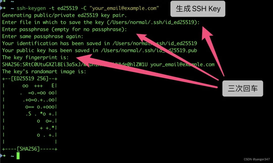 按照提示完成三次回车,即可生成 ssh key。通过查看 ~/.ssh/id_ed25519.pub