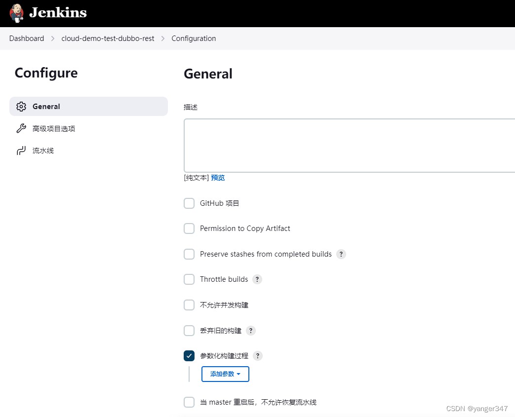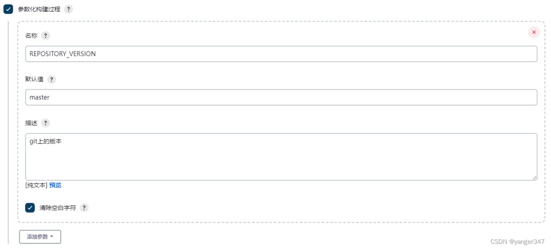 这里勾选参数化构建,选择字符参数,用于输入构建代码的版本
