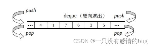 (双端队列)是一种双开口的“连续”空间的数据结构,双开口的含义是:可以在头尾两端进行插入和删除操作,且时间复杂度为 O(1)。