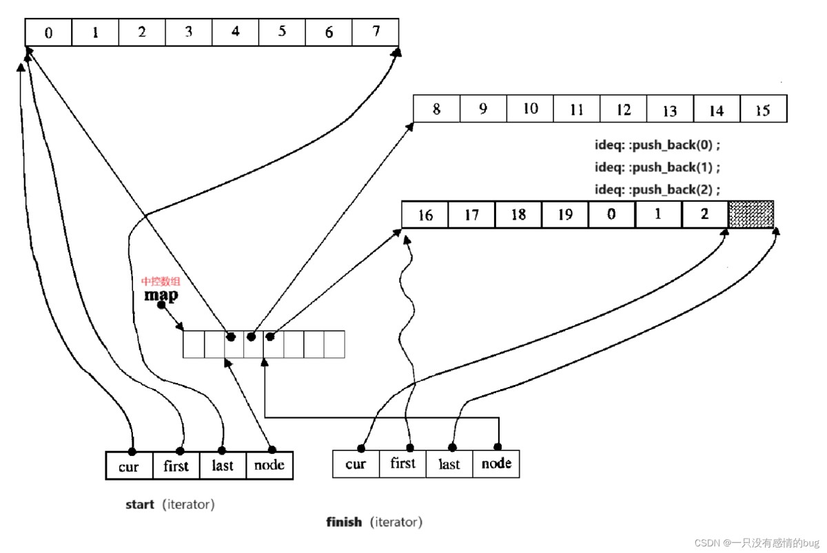 双端队列底层是一段假象的连续空间,实际是分段连续的,为了维护其“整体连续”以及随机访问的假象,落 在了deque
